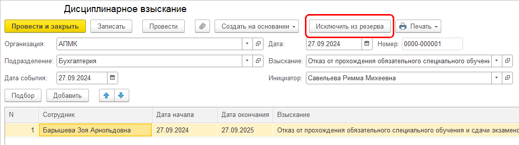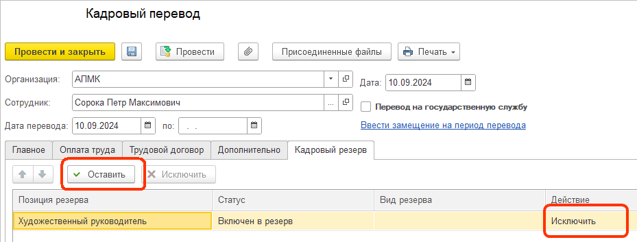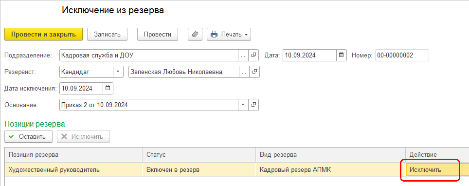 В программе при увольнении или при назначении на должность из кадрового резерва исключение производится непосредственно в самом кадровом документе. При необходимости оставить сотрудника в кадровом резерве – используется специальный переключатель.