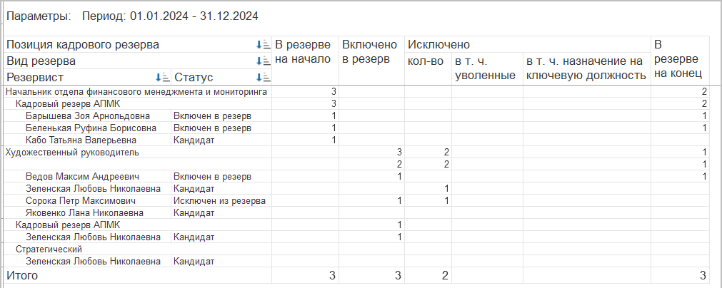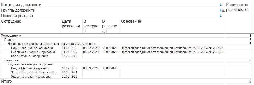 Для удобства работы с кадровым резервом, разработаны различные формы отчетов: