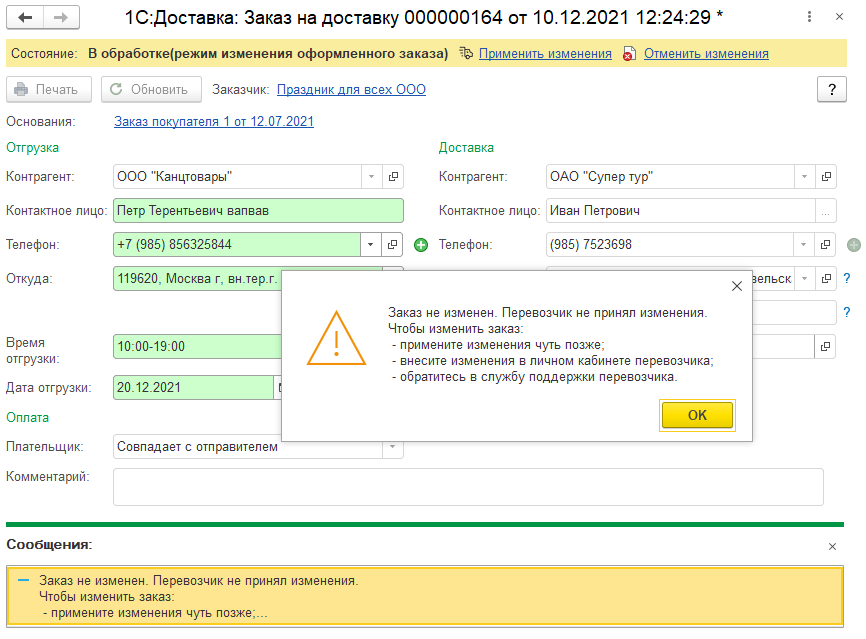 После окончания редактирования для применения изменений необходимо нажать кнопку Применить изменения. В этом случае в сервис отправляются все изменения доступных реквизитов, выполненные пользователем. При успешном выполнении запроса к перевозчику, изменяемые реквизиты фиксируются в заказе на доставку на сервисе.