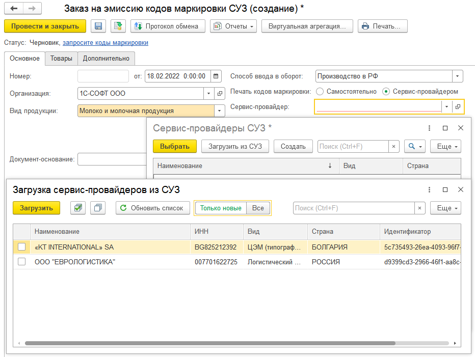 Маркировку продукции выполняет производитель или импортер продукции. Коды маркировки должны быть предварительно заказаны документом Заказ кодов маркировки СУЗ в рабочем месте Обмен с ИС МП. Документ можно создать вручную или оформить автоматически по Заказу на производство. В заказе указывается способ ввода в оборот: Производство в РФ или Импорт в РФ. Печать кодов маркировки может производиться самостоятельно или с привлечением третьего лица - сервис-провайдера. В частности, сервис-провайдером может быть Центр этикетирования и маркировки (ЦЭМ) - это специализированная типография, которая печатает этикетки на продукцию с кодами маркировки.