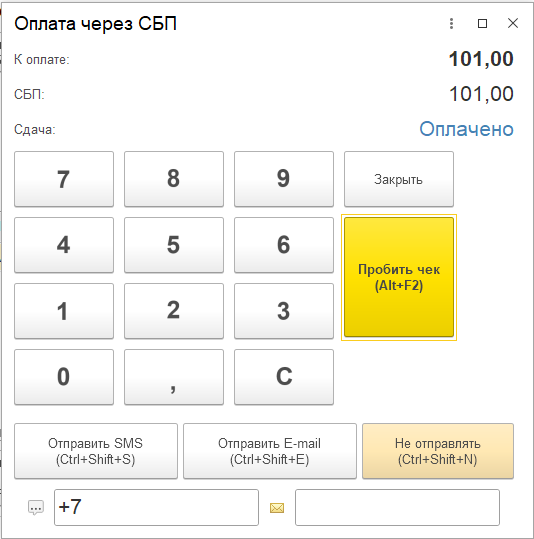 Если из платежной системы за указанное в настройках время ожидания получен положительный ответ о внесении оплаты, открывается форма смешанной оплаты в упрощенном виде - на форме оплаты отображаются только необходимые элементы для завершения операции и пробития фискального чека с этим видом оплаты.