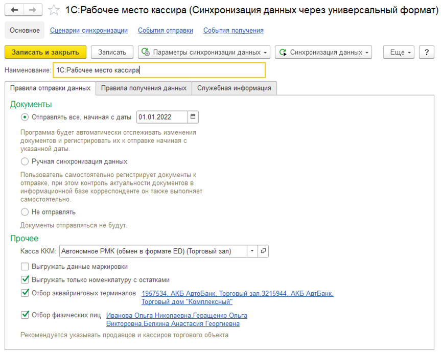 В настройках правил отправки данных можно настроить отбор используемых эквайринговых терминалов, а также физических лиц, работа которых предусмотрено на рабочем месте. В отборе рекомендуется указывать продавцов и кассиров торгового объекта, которые будут работать с 1С:РМК.