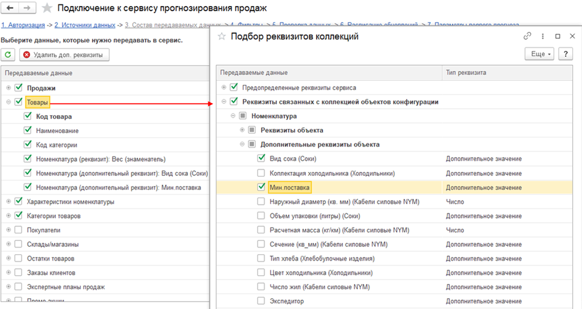 Для некоторых коллекций имеется возможность извлечения таких реквизитов и их выгрузки в сервис прогнозирования продаж. Выбор реквизитов осуществляется при настройке коллекций для выгрузки, двойным кликом на имени коллекции. Будут отображаться все доступные реквизиты, и указан их источник.