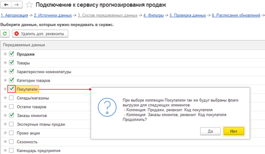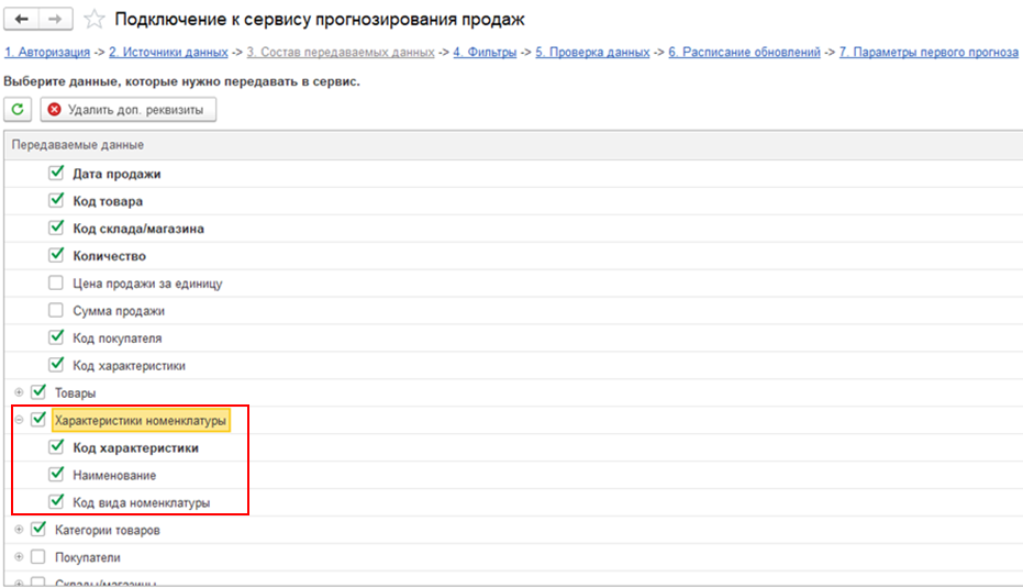 На закладке Состав передаваемых данных в помощнике подключения доступна коллекция «Характеристики номенклатуры» и необходимые поля связи в коллекции «Продажи», «Заказы клиентов», «Экспертные планы продаж», «Промоакции», «Сезонность».