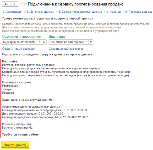 Будут выгружены все документы План продаж по номенклатуре за указанный период, по выбранному Сценарию, в случае если соответствующая коллекция отмечена к выгрузке. Сервис прогнозирования учитывать сообщенную ему информацию при построении собственных прогнозов.