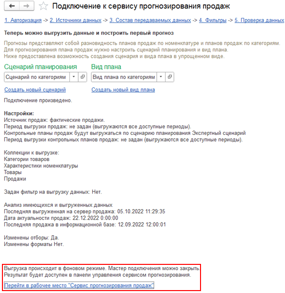 Информация об обучении модели исключена из помощника подключения. Теперь после начала работы можно только закрыть форму и перейти в рабочее место сервиса прогнозирования продаж.