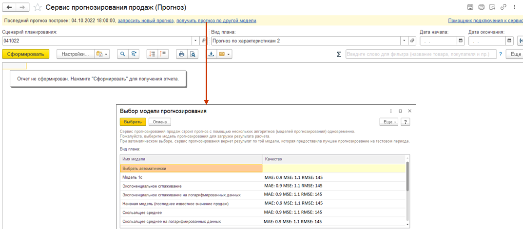 В целях поддержки этой функциональности в рабочем месте сервиса прогнозирования продаж есть гиперссылка Получить прогноз по другой модели, при применении которой открывается форма выбора со списком доступных моделей.