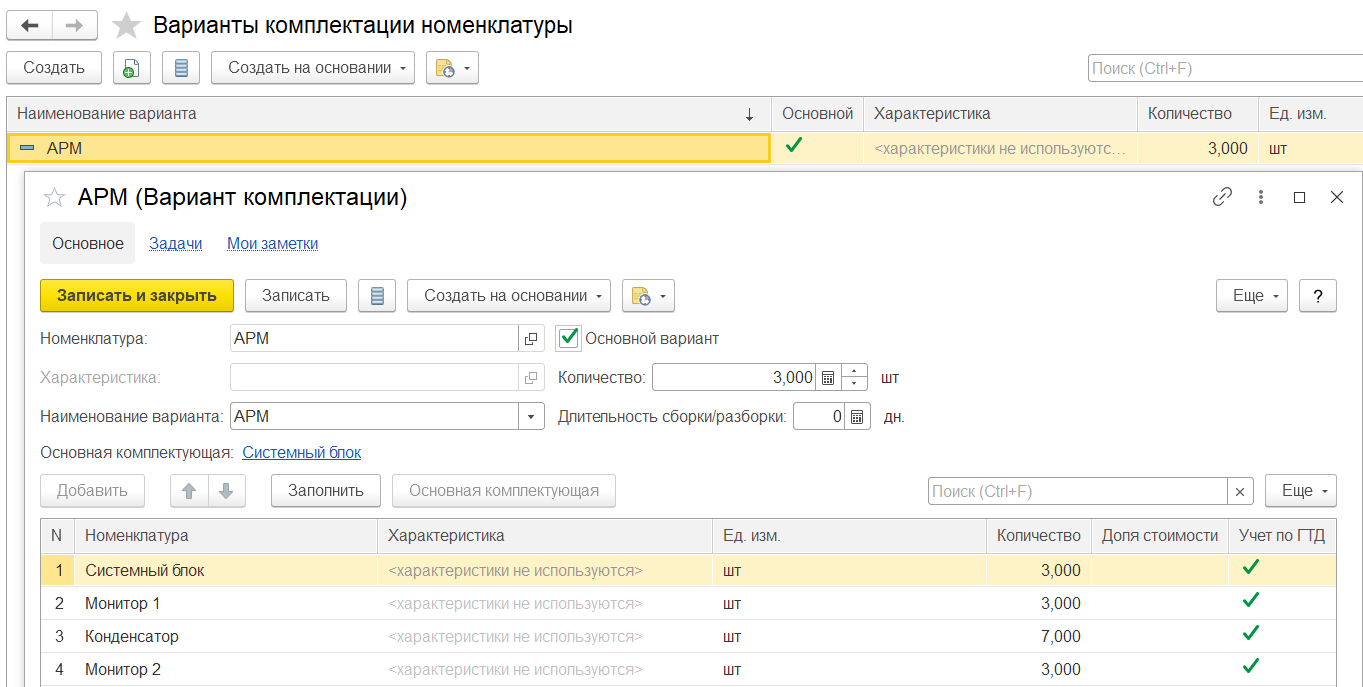 Например, приобретены прослеживаемые электронные платы (персональный компьютер) и несколько мониторов и необходимо из этих комплектующих создать единое АРМ (автоматизированное рабочее место) и продать клиенту.