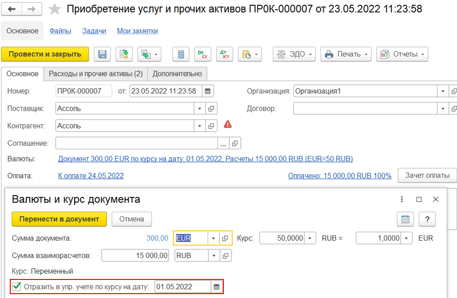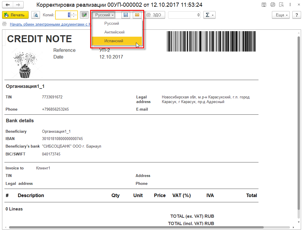 Если печать выполняется с языком отличным от основного, то используются международное наименование и адрес организации и контрагента, а также международные реквизиты банка.