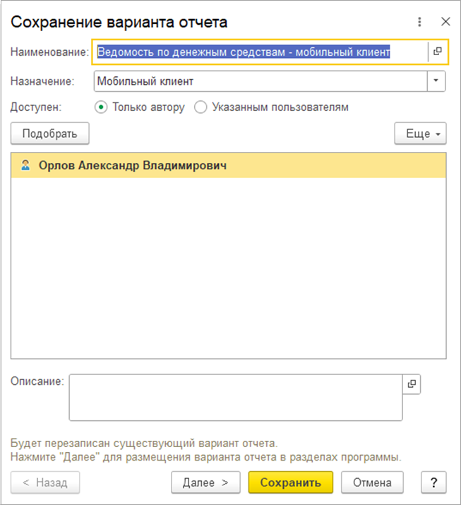 Данный функционал реализован за счет сохранения ранее сформированных отчетов в табличный документ в формате mxl. Для этих целей добавлены соответствующие команды в форму отчета. Отчеты сохраняются для каждого пользователя в разрезе варианта отчета дашборда МЦП.