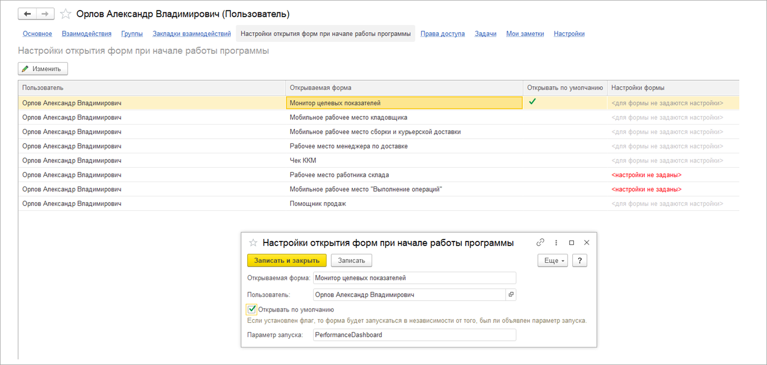Для того чтобы в мобильном клиенте автоматически открывался Монитор целевых показателей, необходимо в карточке элемента справочника Пользователи (раздел НСИ и администрирование – Администрирование – Настройки пользователей и прав - Пользователи) в контекстном меню выбрать пункт Настройки открытия форм при начале работы программы. Далее в карточке элемента справочника Настройки открытия форм при начале работы программы с выбранным значением Монитор целевых показателей в поле Открываемая форма установить флаг Открывать по умолчанию.
