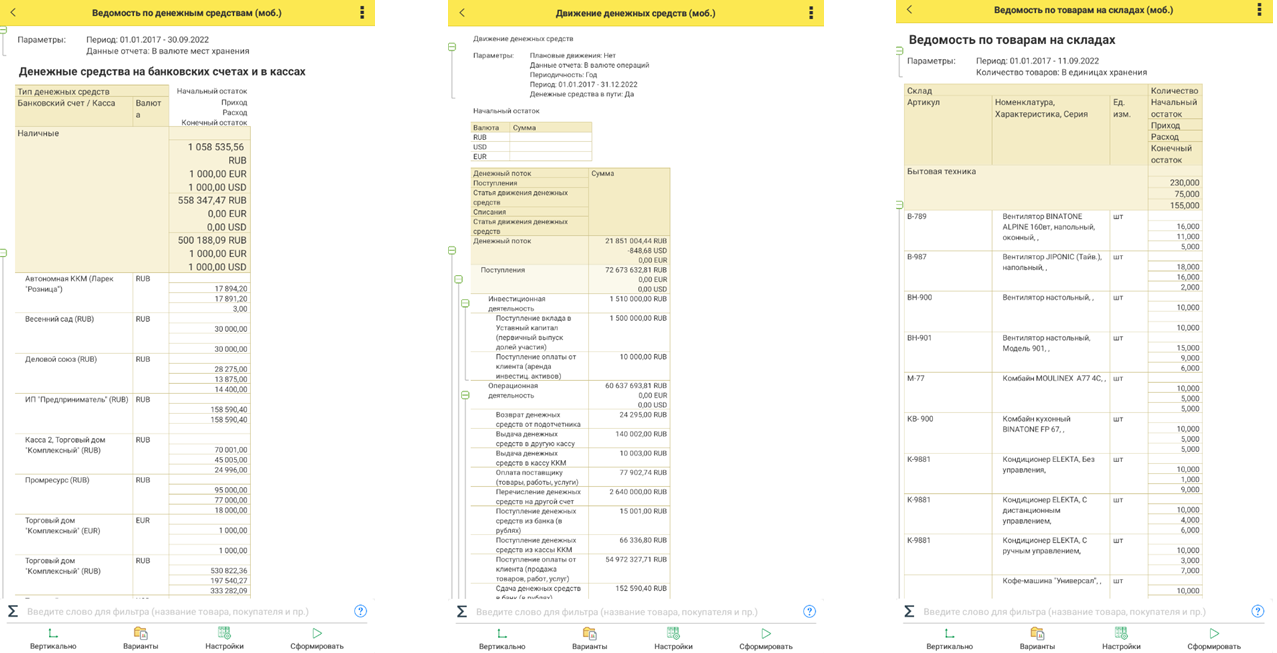 В системе настроены предопределенные варианты отчетов для мобильного клиента, такие как: