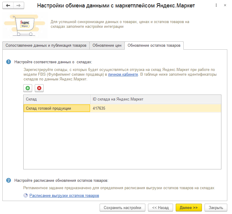 Выгрузка информации об остатках является необходимым условием для начала продаж по модели FBS. При настроенной интеграции с маркетплейсом (включена функциональная опция Использовать интеграцию с Яндекс.Маркет) выгрузка осуществляется автоматически фоновым заданием. Выгружаются свободные (не зарезервированные) остатки товаров, для которых выполняются следующие условия: