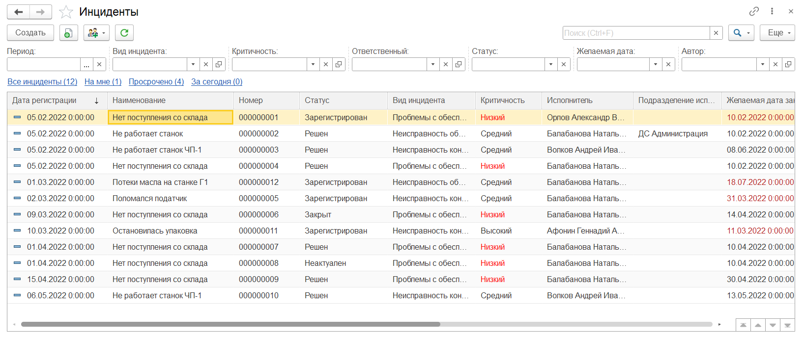 Просроченные инциденты выделяются цветом.