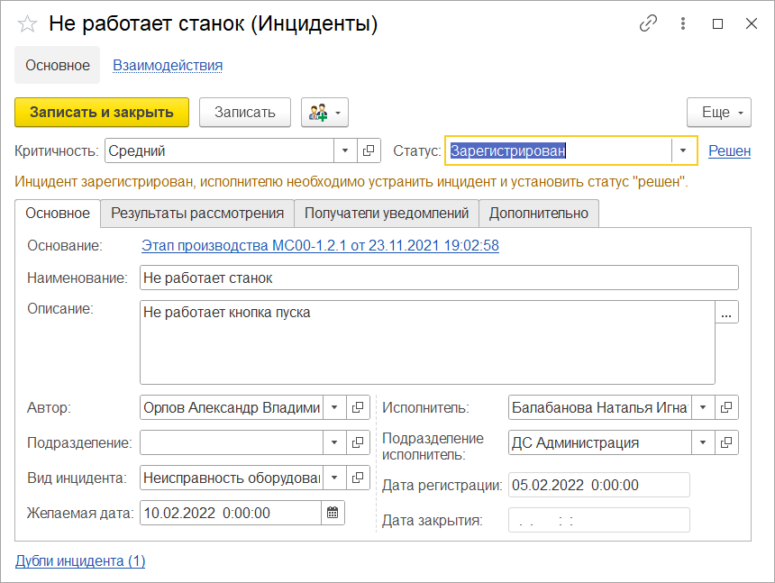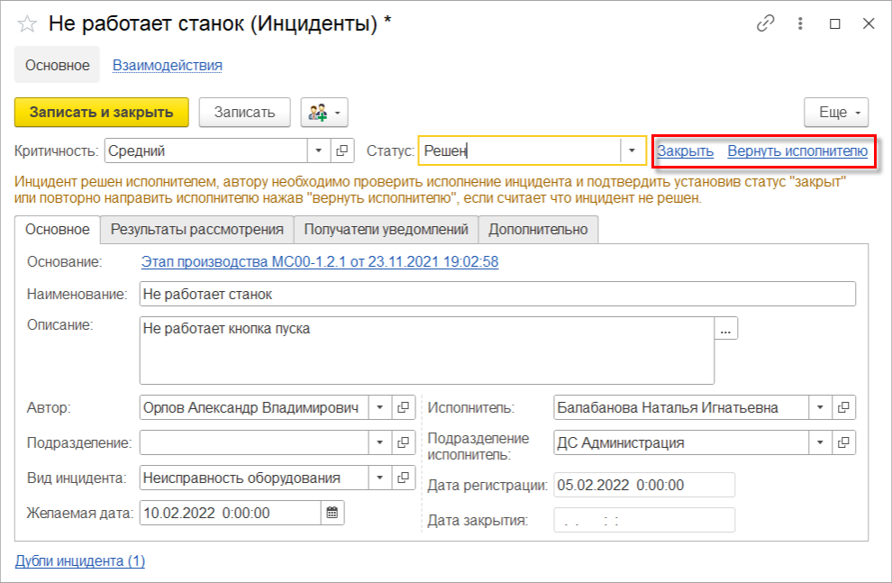 Если рассмотрение инцидента находится в зоне ответственности текущего исполнителя и инцидент не является дублем, то он принимает решение по инциденту и указывает результат рассмотрения на закладке Результаты рассмотрения и переводит инцидент в статус Решен.