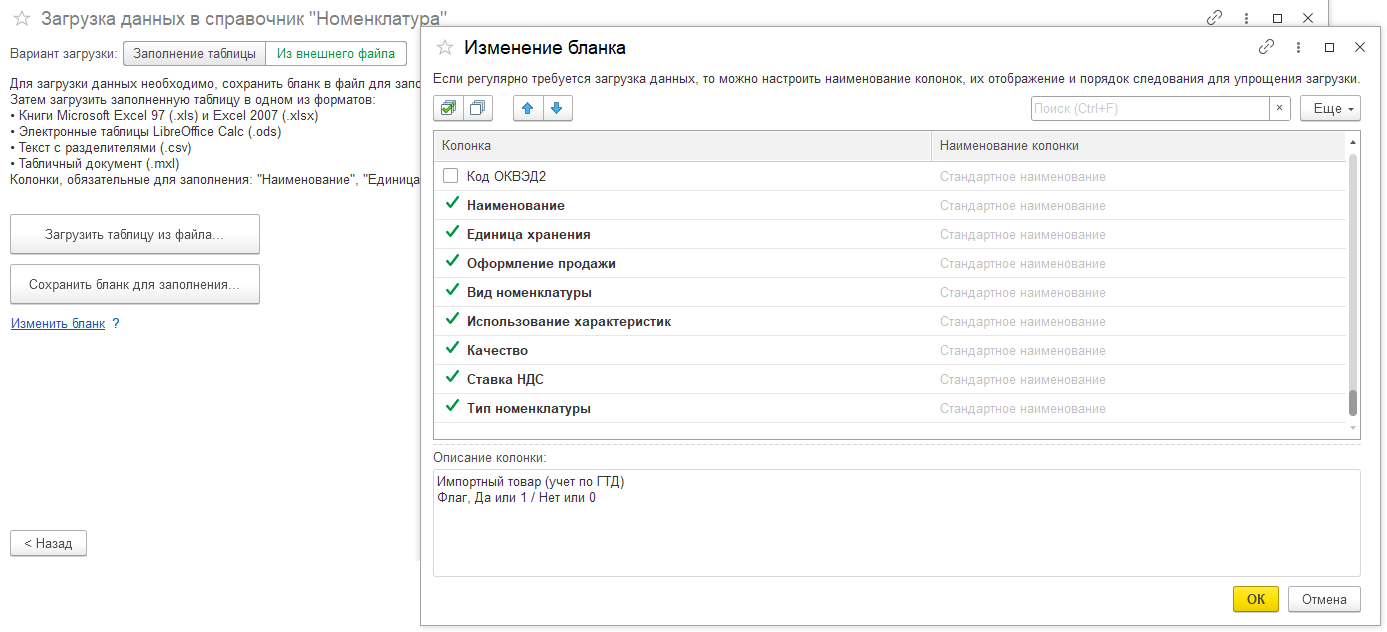 При начальном заполнении информационной базы доступна загрузка элементов отдельных справочников, в том числе справочника Номенклатура из таблицы или внешнего файла.