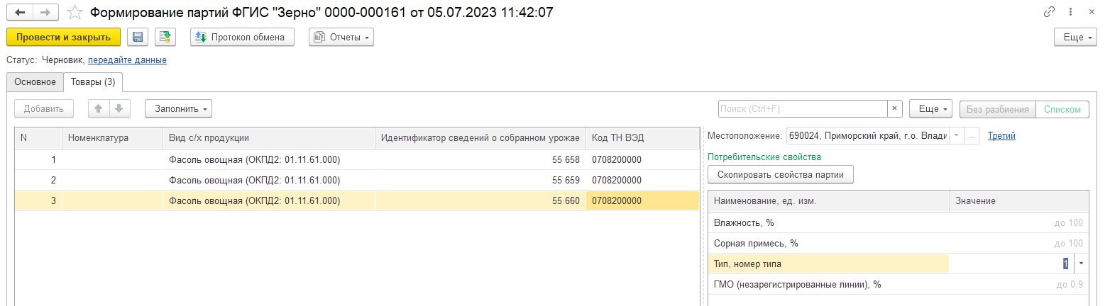 Для операции При сборе урожая требуется обязательное указание документа-основания Внесение сведений о собранном урожае. На основании данного документа автоматически заполняется реквизит Идентификатор сведений о собранном урожае на закладке Товары.
