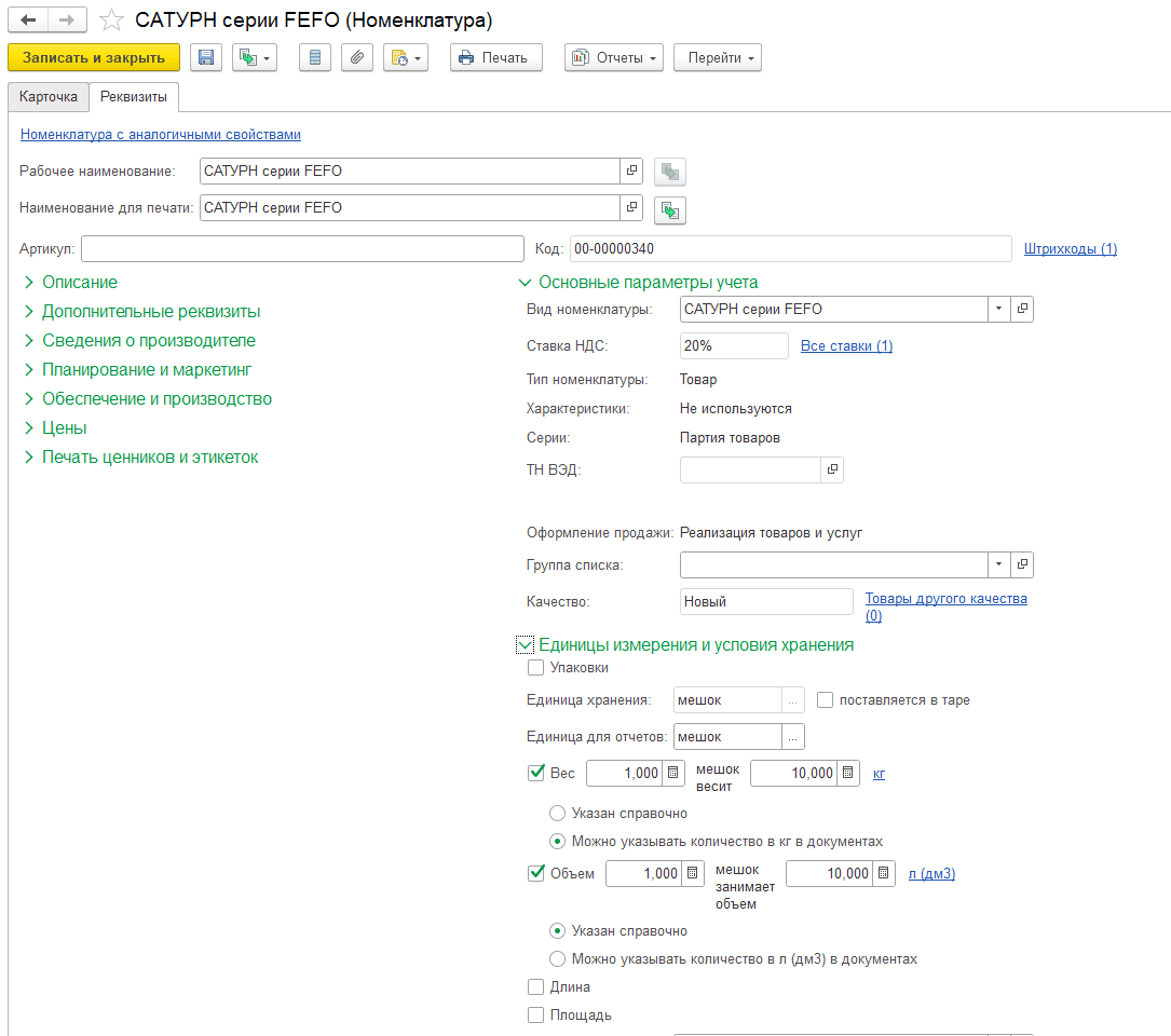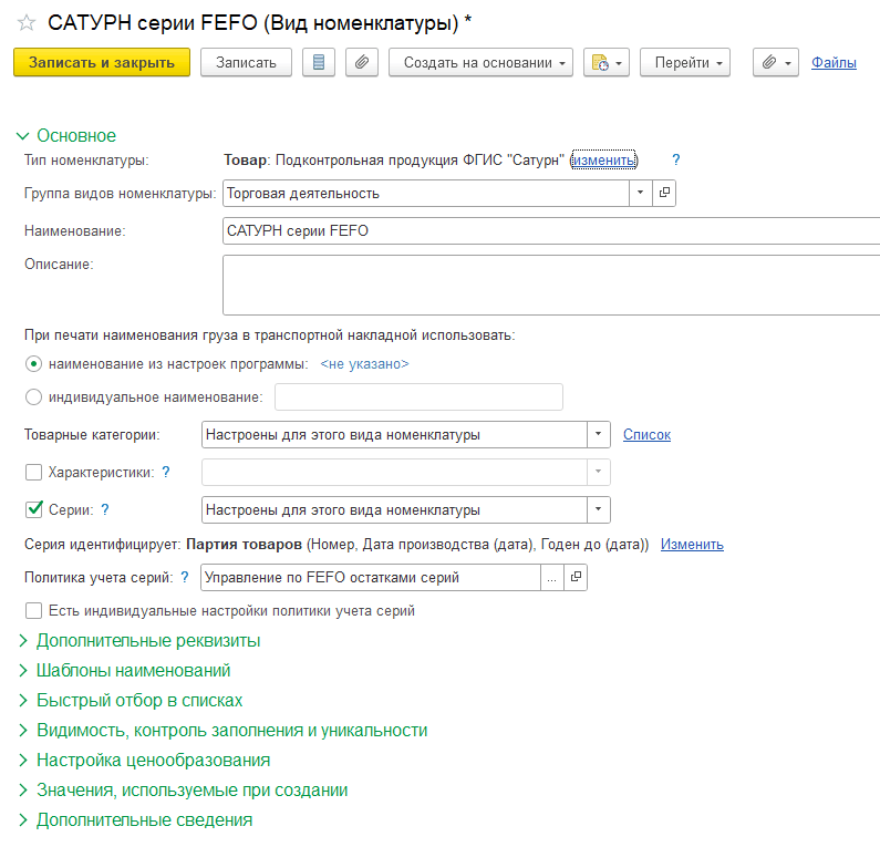 Для номенклатурных позиций, которые попадают под требования отражения во ФГИС "Сатурн", необходимо использовать Вид номенклатуры с указанием особенности учета Подконтрольная продукция ФГИС Сатурн.