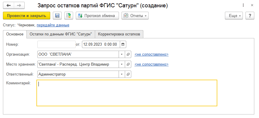 Перед началом работы выполнить синхронизацию классификаторов, партий и остатков. Для этого можно использовать документ Запрос остатков продукции ФГИС Сатурн. Загрузка остатков партий выполняется по организации по классификатору ФГИС Сатурн. Место хранения может быть не указано. В этом случае из ФГИС Сатурн будут загружены остатки партий по всем местам хранения.