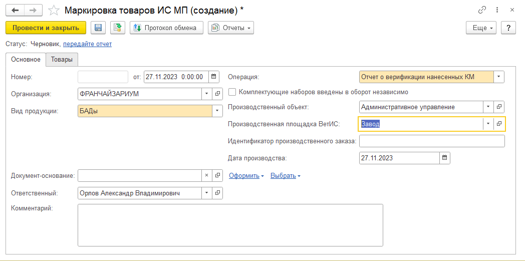 В документе Импорт продукции ФГИС "Сатурн" указывается организация и место хранения по классификаторам ФГИС "Сатурн", а также сопоставленные с ними соответствующие значения по данным информационной базы в виде гиперссылки. Также на закладке основное указывается документ-основание, отражающий операцию в учете, номер ТТН и дата получения. На закладке Товары указывается ПАТ, партия, количество по данным ФГИС "Сатурн", а также номенклатура и серия по данным информационной базы.