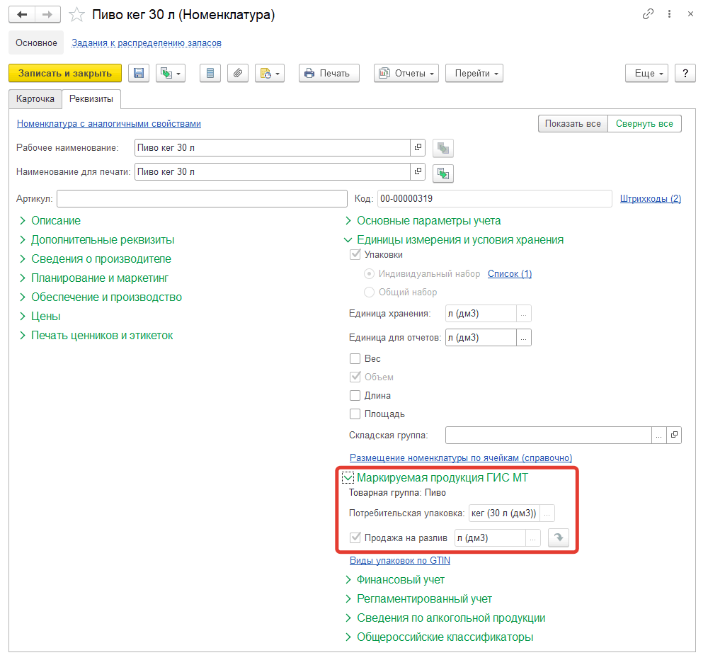 В группе настроек Маркируемая продукция ГИС МТ указывается потребительская упаковка: кег (30 л(дм3)), а также устанавливается флаг Продажа на разлив и указывается единица л (дм3) (рис. 1).
