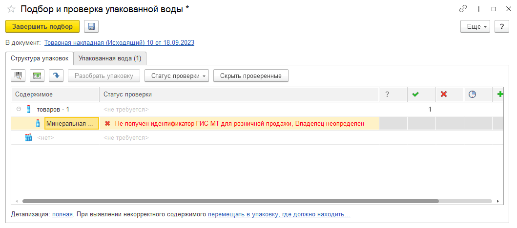 При обнаружении ошибок ссылка статуса проверки будет содержать описание этой ошибки (ошибок) и указание количества ошибок в скобках, например «Есть коды маркировки с ошибками (1)». В этом случае рекомендуется исправить ошибки, после чего, документ можно отправить на повторную предварительную проверку в ГИС МТ. Однако отрицательный результат проверки не блокируют дальнейшую работу с документом. Решение по дальнейшим действиям принимает пользователь самостоятельно, в том числе может отправить документ без исправления под свою ответственность.
