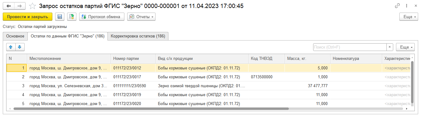 Для запроса остатков партий используется документ Запрос остатков партий ФГИС Зерно. Загружаться могут собственные остатки, а также остатки, находящиеся на хранении на элеваторе. После получения остатков на закладке Остатки по данным ФГИС «Зерно», будут заполнены партии зерна и продуктов его переработки. Для каждой партии указывается Местоположение, Номер партии, Вид с/х продукции (ОКПД2), Код ТНВЭД и масса в кг. Остатки по партиям загружаются в табличную часть Остатки по данным ФГИС Зерно и используются для проведения по регистру остатков партий зерна.