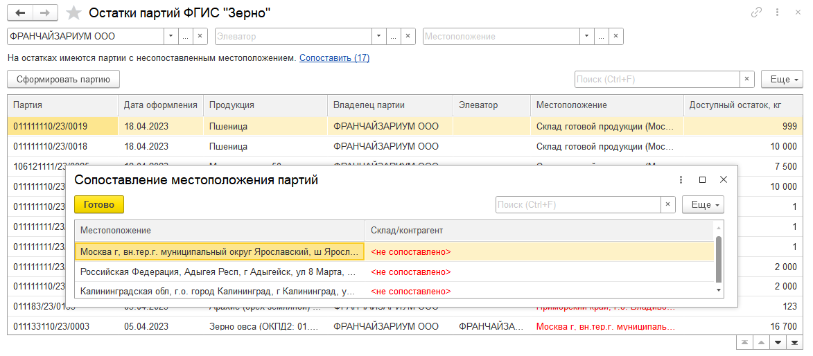 Для остатков партий также требуется сопоставление местоположения партии со складами или контрагентами (для остатков на хранении на элеваторе) информационной базы 1С. Красным цветом выделены адреса, не сопоставленные со складами или контрагентами.