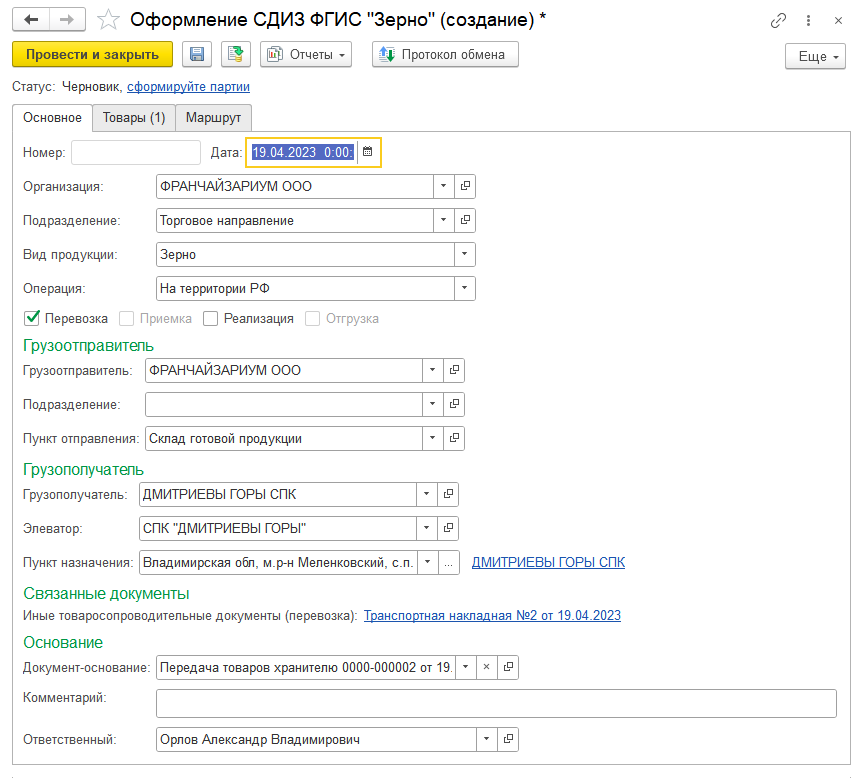 В документе заполняются автоматически все необходимые поля. Если элеватор числится в реестре элеваторов ФГИС Зерно, то при оформлении СДИЗ будет автоматически указан его реестровый номер.