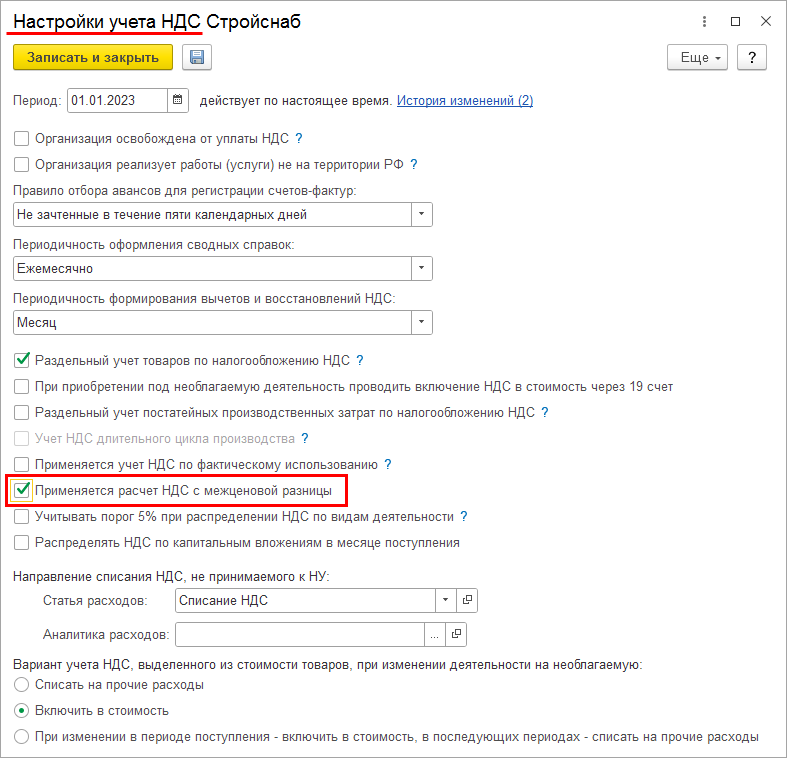 В раздел Настройки учета НДС учетной политики организации добавлена настройка Применяется расчет НДС с межценовой разницы.