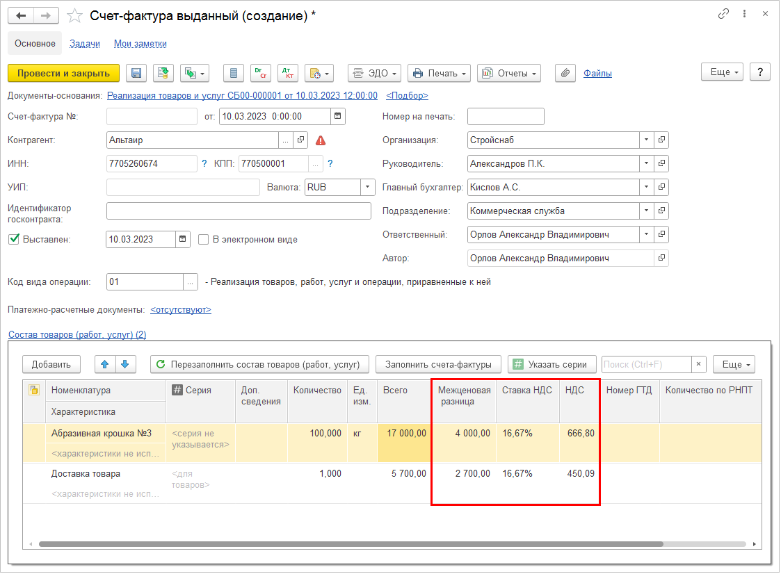 На основании документа реализации пользователю необходимо оформить документ Счет-фактура выданный, где в табличной части Состав товаров (работ, услуг) вручную указать суммы межценовой разницы и ставки НДС (9,09% или 16,67%). Суммы НДС будут рассчитаны автоматически.