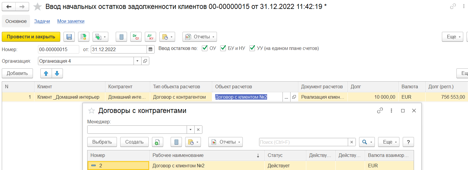 Если в документе ввода начальных остатков задолженности указан клиент/партнер = комиссионер и объект расчетов = договор с клиентом, то возникает долг комиссионера перед комитентом по договору с клиентом. В первичном документе Реализация клиенту на выбор доступен договор с клиентом.
