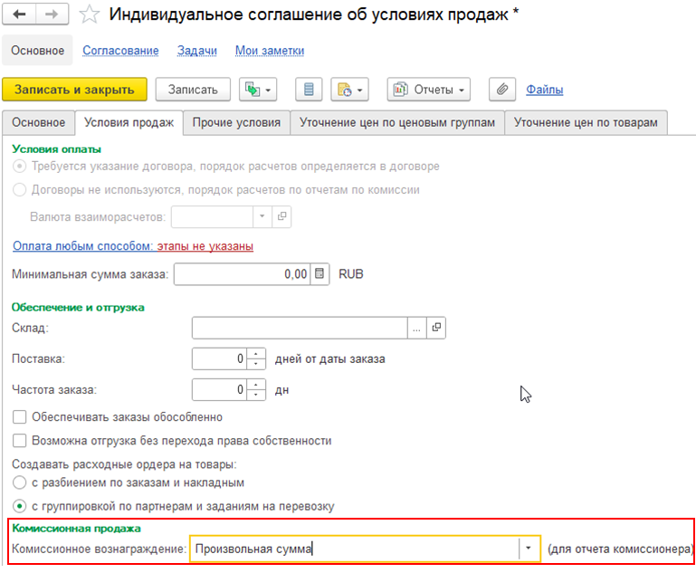 В соглашении об условиях продажи с типом операции Передача на комиссию предусмотрен на выбор новый способ расчета комиссионного вознаграждения Произвольная сумма (для версий комиссионной продажи 11.0 и 11.5). Поле процент при этом скрывается.
