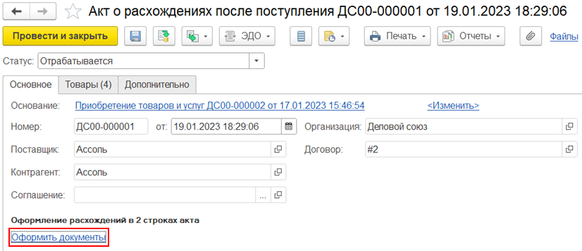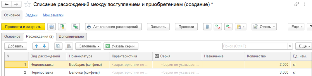 Одним документом могут быть списаны расхождения разных видов (недопоставка, перепоставка).