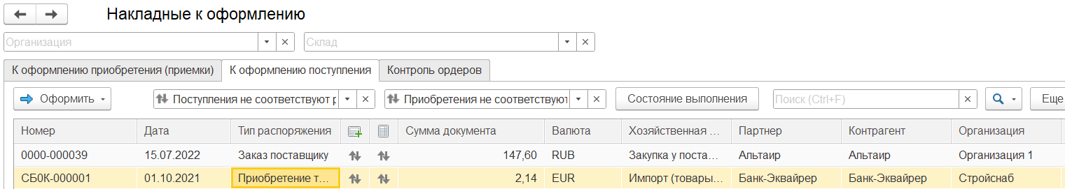 показывает, что поступление не соответствует распоряжению и/или приобретение не соответствует поступлению.