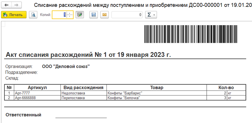 По данным документа Списание расхождений между поступлением и приобретением предусмотрена печать акта о списании расхождений.
