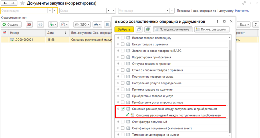 В сценарии недопоставки документ Списание расхождений между поступлением и приобретением также закрывает расхождения в «Товарах организаций» по собственным товарам по номерам ГТД и по Количеству по РНПТ.