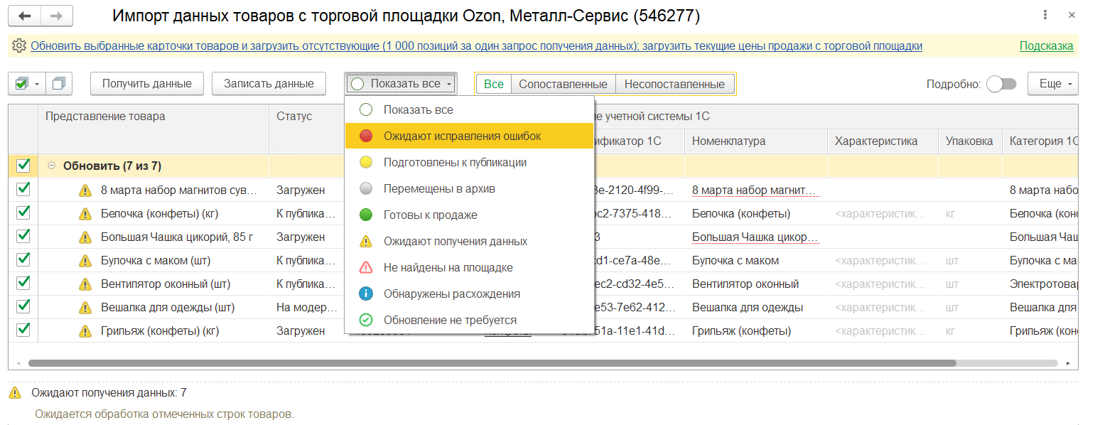 Сопоставление необходимо для обновления цен и остатков, а также для указания номенклатуры информационной базы при выгрузке и загрузке документов. Загрузка полной информации о товарах с площадки маркетплейса позволит в дальнейшем управлять товарным каталогом торговой площадки из информационной базы: редактировать описание товаров в информационной системе и выгружать на торговую площадку.