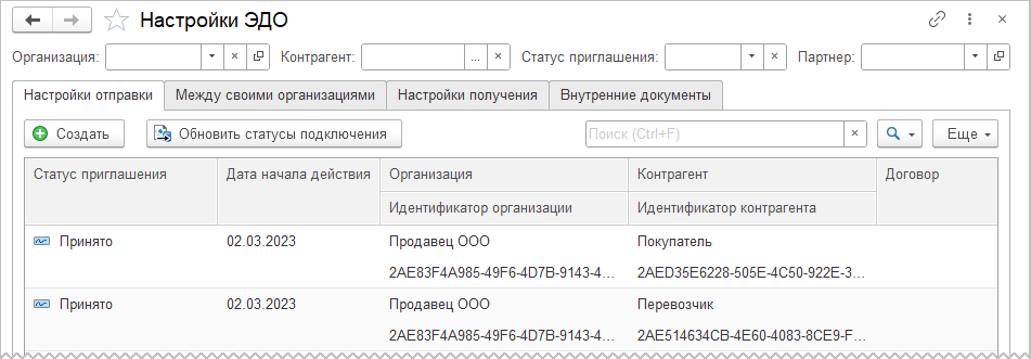 Обе организации должны быть подключены к ЭДО, а в информационной базе по каждой организации должна быть настроена Учетная запись ЭДО в разделе НСИ и администрирование – Настройка интеграции – Обмен электронными документами – Обмен с контрагентами – Учетные записи ЭДО.