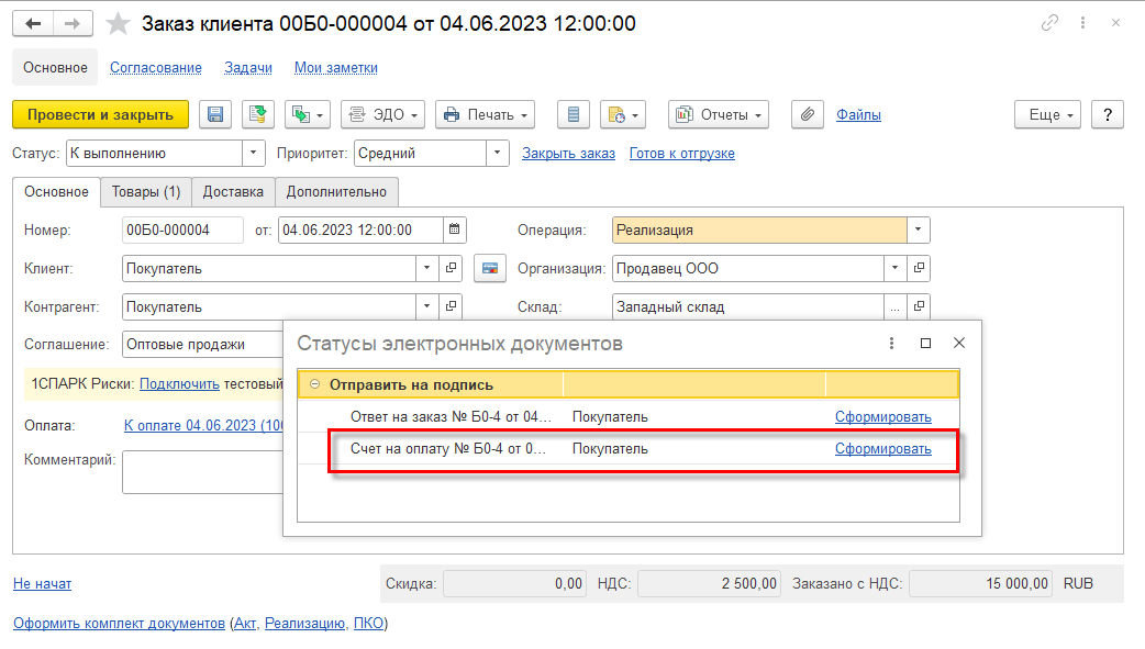 После успешного согласования статус заказа автоматически устанавливается в значение К выполнению.