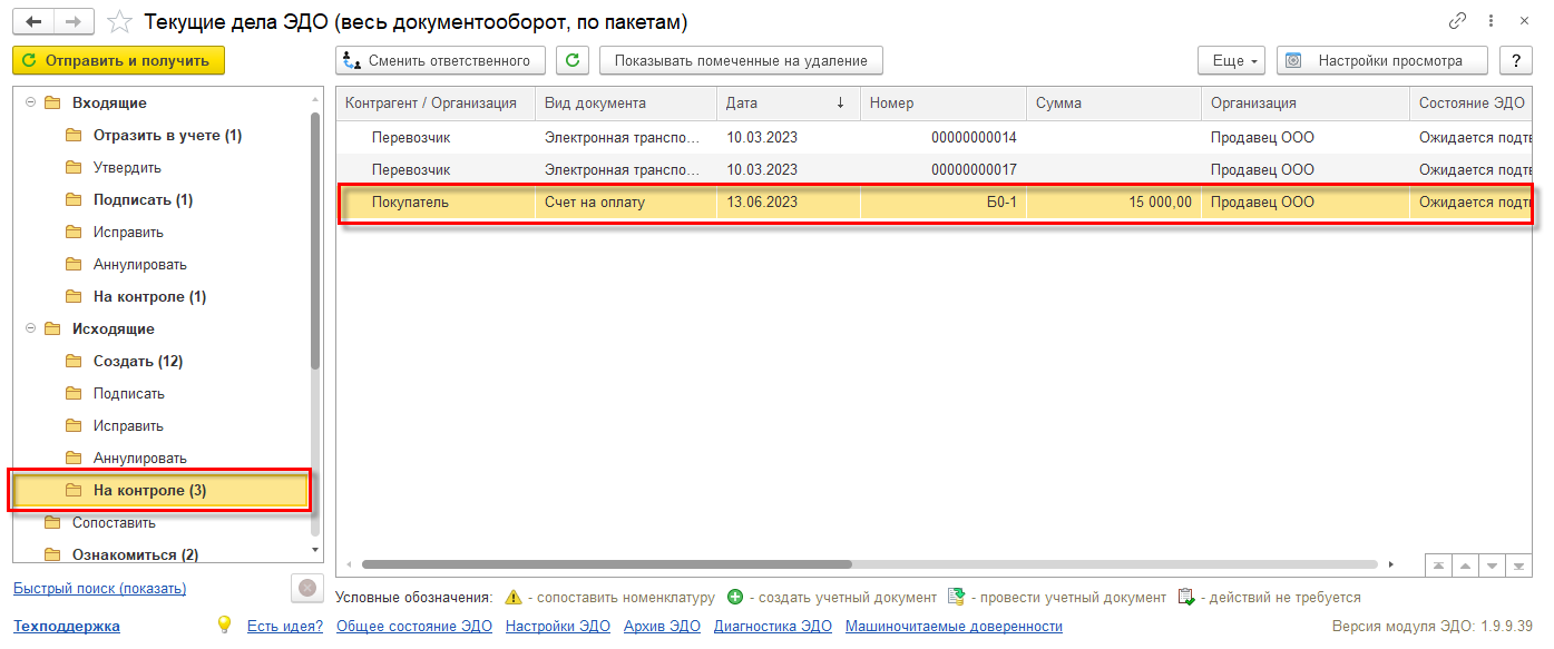 На стороне организации-продавца документ будет загружен при очередном информационном обмен с оператором ЭДО по настроенному расписанию (для клиент-серверного варианта) или при выполнении команды Отправить и получить из списка Главное – ЭДО - Текущие дела ЭДО.