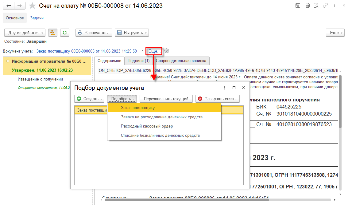 Если входящий электронный счет уже был связан с документом информационной базы и требуется дополнительно связать с еще одним документом, то это можно выполнить из формы Подбор документов учета, которую можно открыть из формы просмотра электронного документа по ссылке Еще.