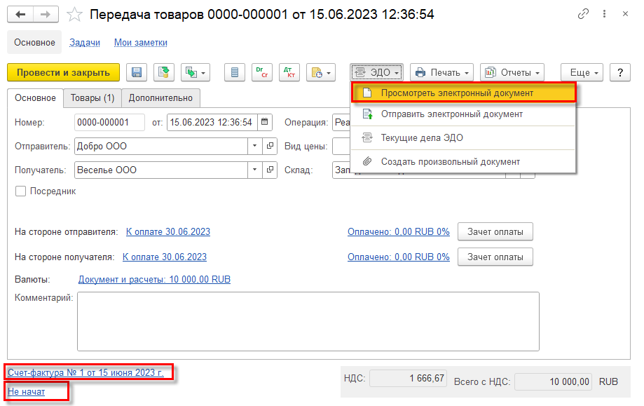 При указанных выше настройках получения документов входящий электронный документ будет автоматически привязан к учетным документам Передача товаров и Счет-фактура, которые будет определены по уникальному идентификатору, присвоенному при формировании электронного документа на стороне отправителя. В графе Отражение в учете сразу появится гиперссылка на эти документы учета (2 документа).