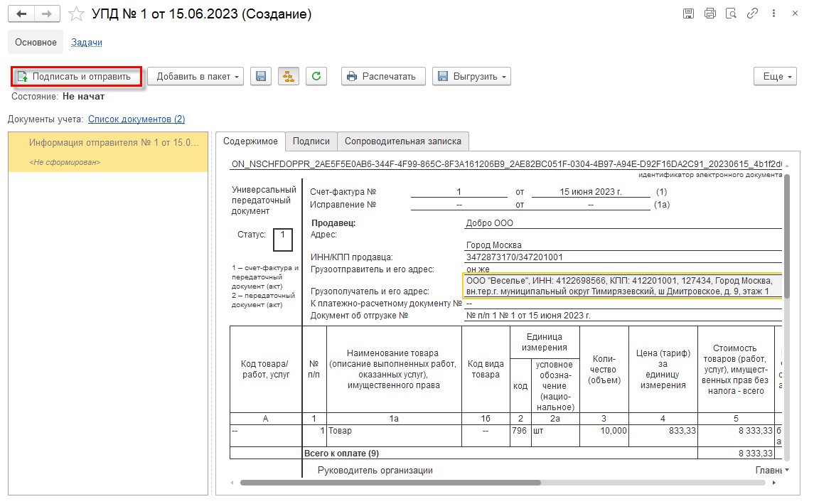 После утверждения товарной накладной формируется раздел УПД «информация получателя». Просмотреть информацию покупателя можно в форме просмотр электронного документа.