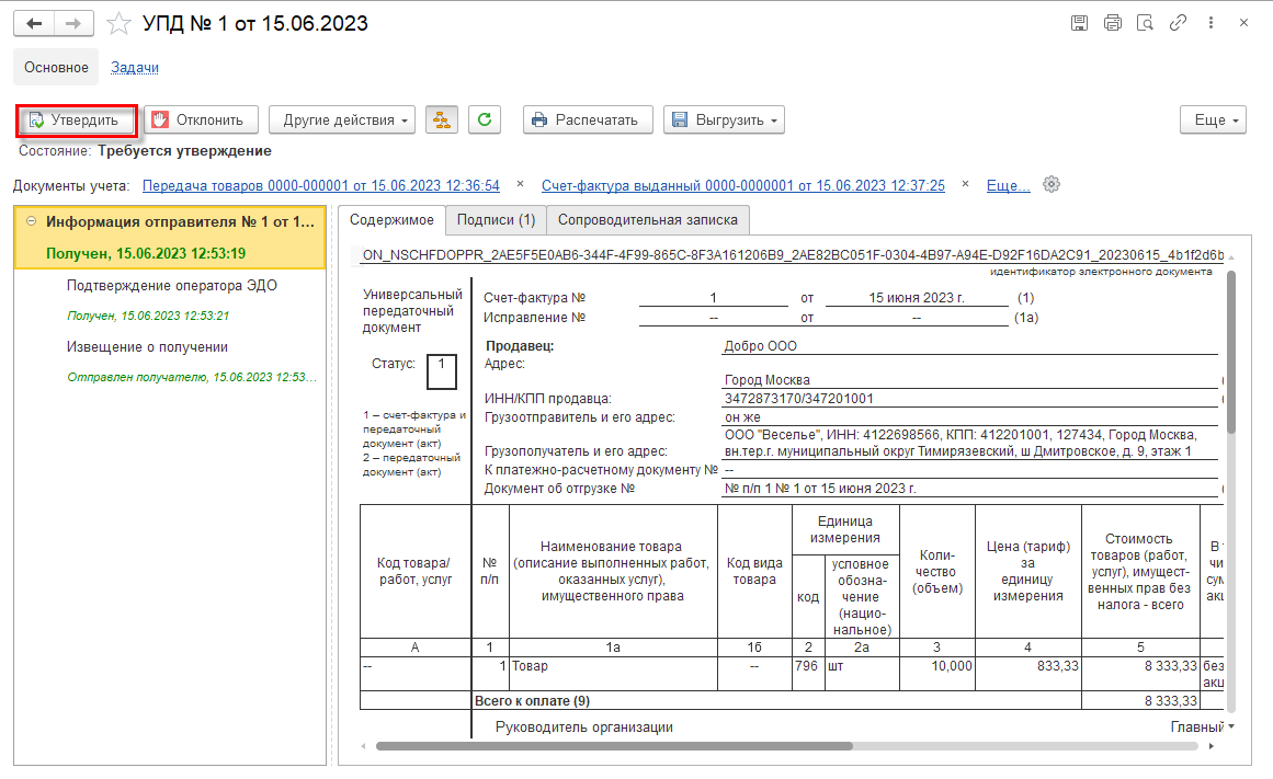 Для завершения сделки, если претензий к показателям УПД нет, покупатель должен утвердить полученный документ. Сделать это можно следующим образом: