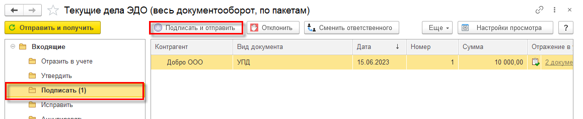 Если у текущего пользователя нет права подписи, то программа направит сформированный электронный УПД на подпись лицу, имеющему такое право. Подписание сформированных электронных документов лицом, имеющим право электронной подписи, можно произвести в рабочем месте Текущие дела ЭДО в папке Исходящие\Подписать по кнопке Подписать и отправить.