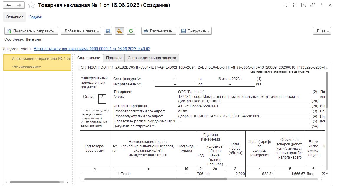 Для оформления возврата в информационной базе должен быть введен документ Возврат между организациями и счет-фактура к нему. Документооборот начинается со стороны организации-покупателя, которая оформляет Товарную накладную (УПД со статусом «2 – Передаточный документ (акт)»). Это можно сделать следующим образом:
