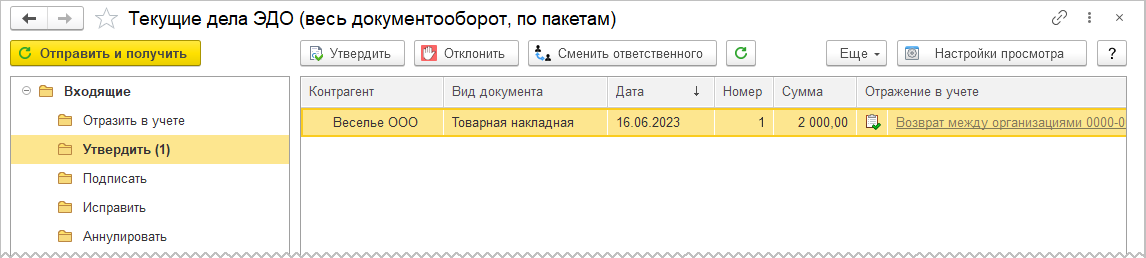 При указанных выше настройках получения документов входящий электронный документ будет автоматически привязан к документу Возврат между организациями, который будет определены по уникальному идентификатору, присвоенному при формировании электронного документа на стороне отправителя (организации-покупателя). В графе Отражение в учете сразу появится гиперссылка на этот документ.