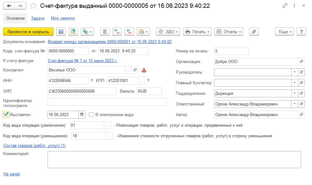 При возврате организация-покупатель формирует передаточный акт (товарную накладную на возврат) из документа Возврат между организациями. Организация-продавец формирует электронный корректировочный счет-фактуру.