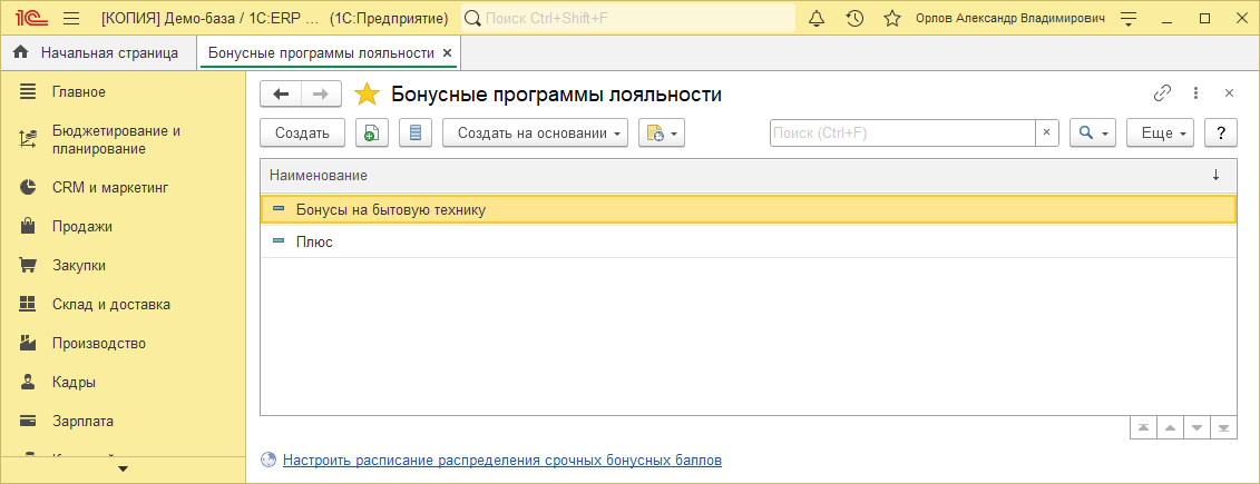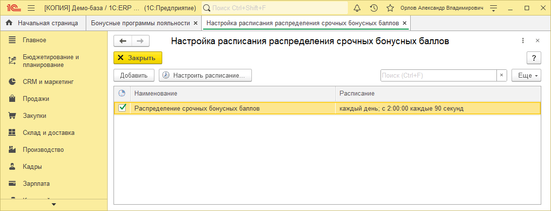На форму списка справочника "Бонусные программы лояльности" добавлена гиперссылка "Настроить расписание распределения срочных бонусных баллов". Настраивать расписание может пользователь, у которого есть права на изменение справочника "Бонусные программы лояльности". В остальных случаях пользователь может только просматривать список заданий.